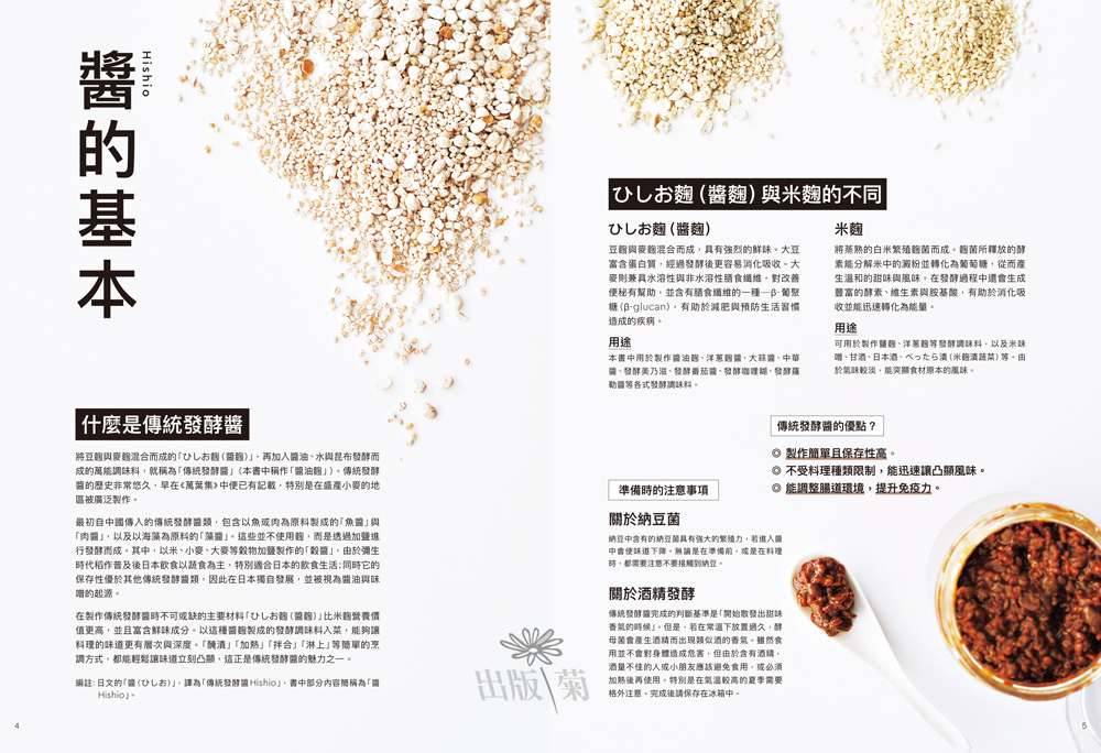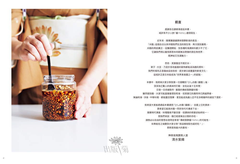 「醬」在日文讀做Hishio,泛指以麴發酵製成的調味品,近年來,隨著腸道健康與發酵飲食的普及,「麴」這個自古以來伴隨我們生活的微生物,再次受到重視。麴的用途廣泛—從米麴釀酒開始,到各種和食調味料都少不了,它讓我們得以看見那原本肉眼無法察覺的微生物世界,既神祕又充滿魅力。麴並不限於米,麥子、大豆,乃至於各地盛產的穀物都能成為麴的原料,它的應用也早已跨越界線,無論和食、洋食、中華料理,都能靈活發揮,甚至成為讓人忍不住多喝幾杯的絕佳下酒菜。