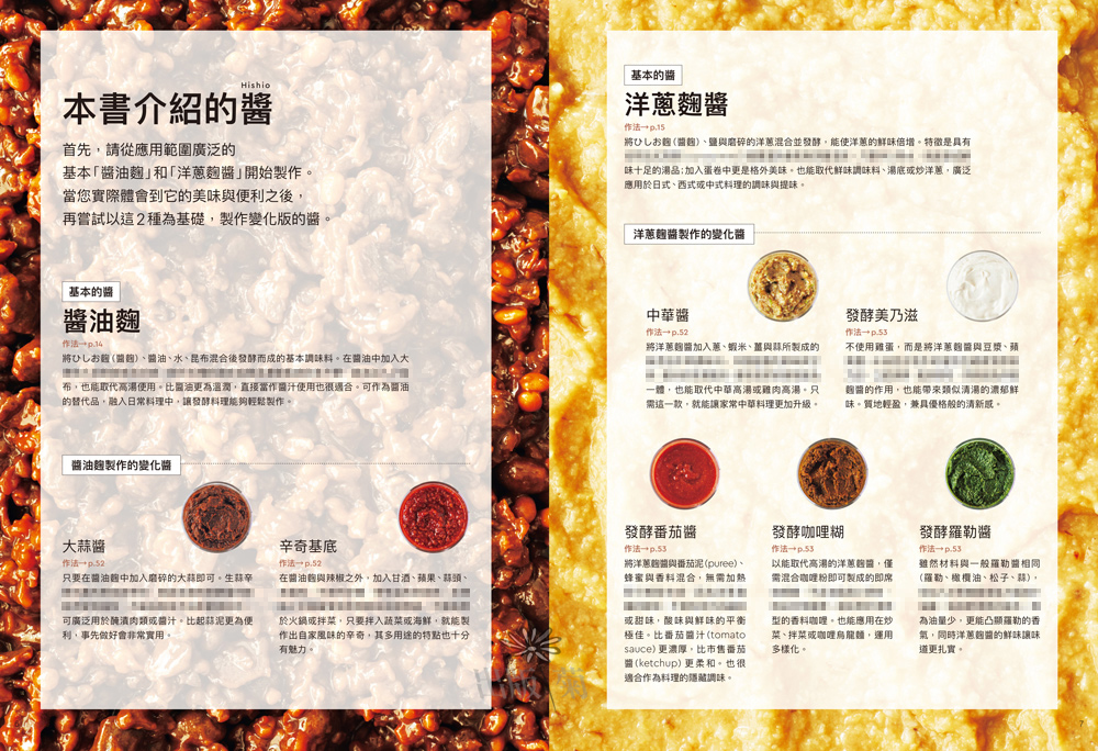 本書以「麴(醬麴)」為材料,用非常簡單易學、保存性高的方式製成16 種發酵醬,包括: