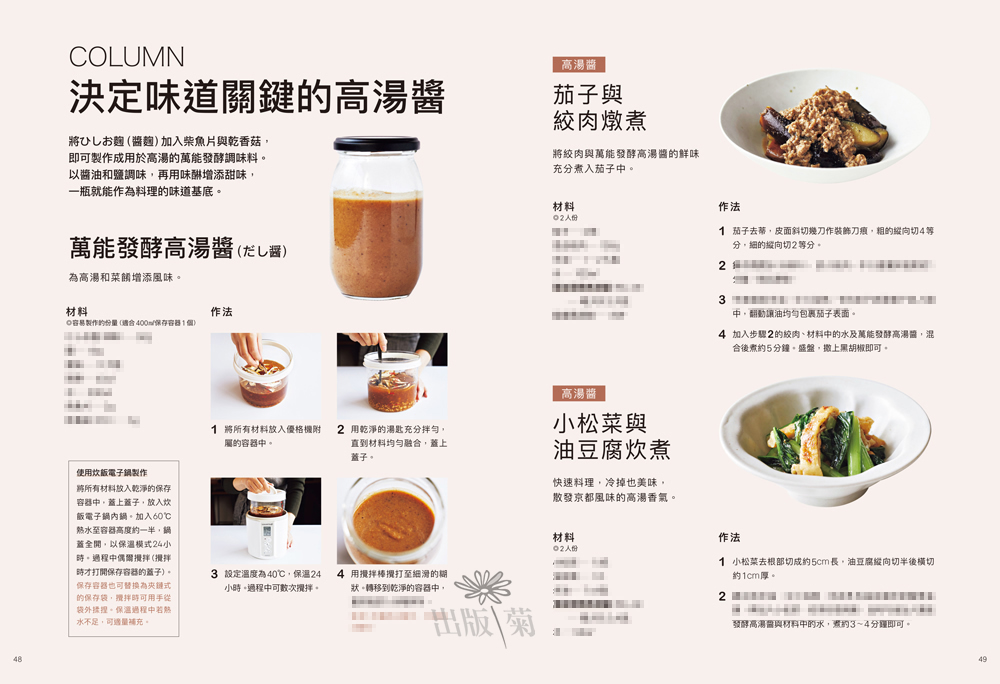 喜歡喝味噌湯?吃粥總想配一塊豆腐乳?熱愛滑嫩帶鮮味的豆豉排骨?…這些美味全都是借重於發酵而來,而「醬発酵料理帖」正是將古老又新潮的發酵力量,轉換成容易製作、好保存的調味醬,隨時都可以加入1小匙,立刻讓料理瞬間升級的秘密法寶!